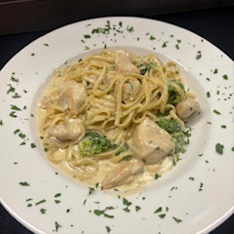 Pasta tossed with fresh broccoli and seared chicken in a creamy Alfredo sauce.