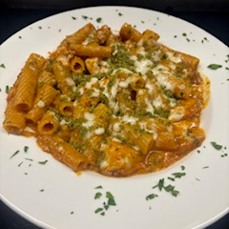 Pan seared chicken tossed with our famous white wine blush sauce. Topped with mozzarella cheese and served over pasta.