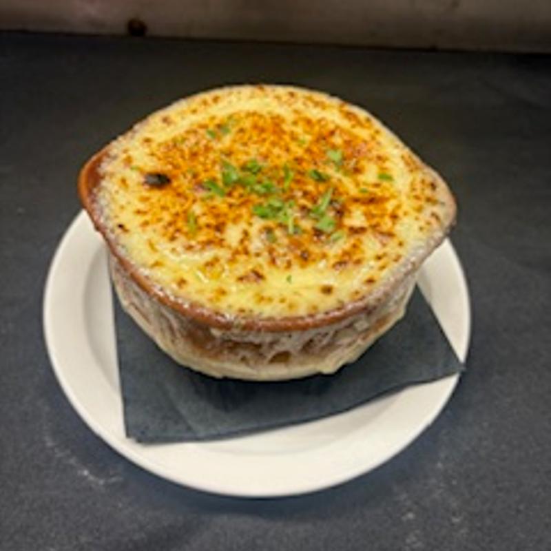 Classic French onion soup with homemade toast points and melted Swiss cheese.