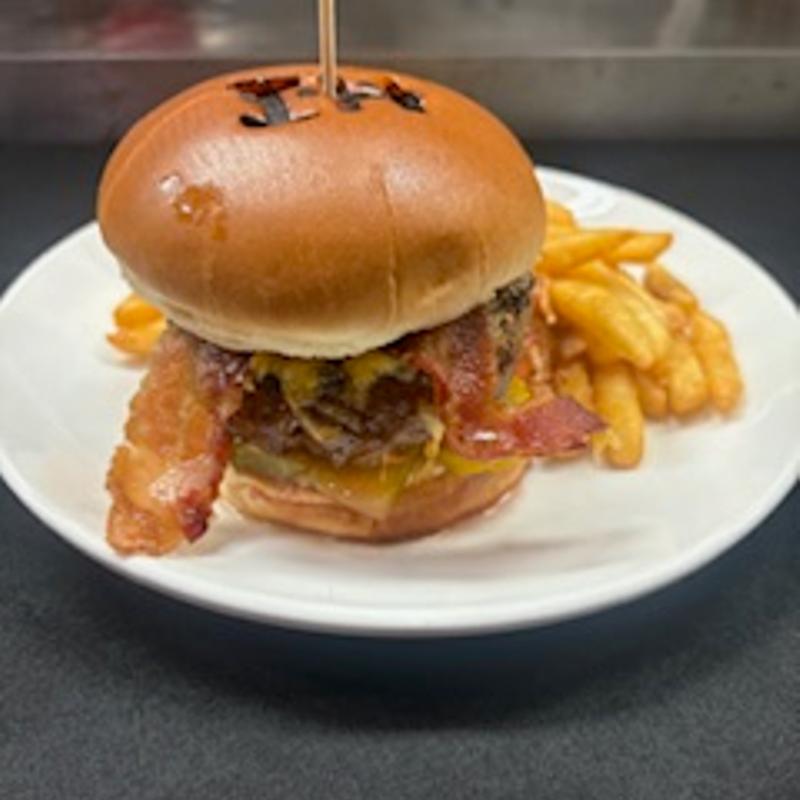 Half pound burger with aged cheddar cheese, thick cut bacon, pickled red onions, sliced dill pickles and bacon onion jam. Served on a brioche bun | Served with fries