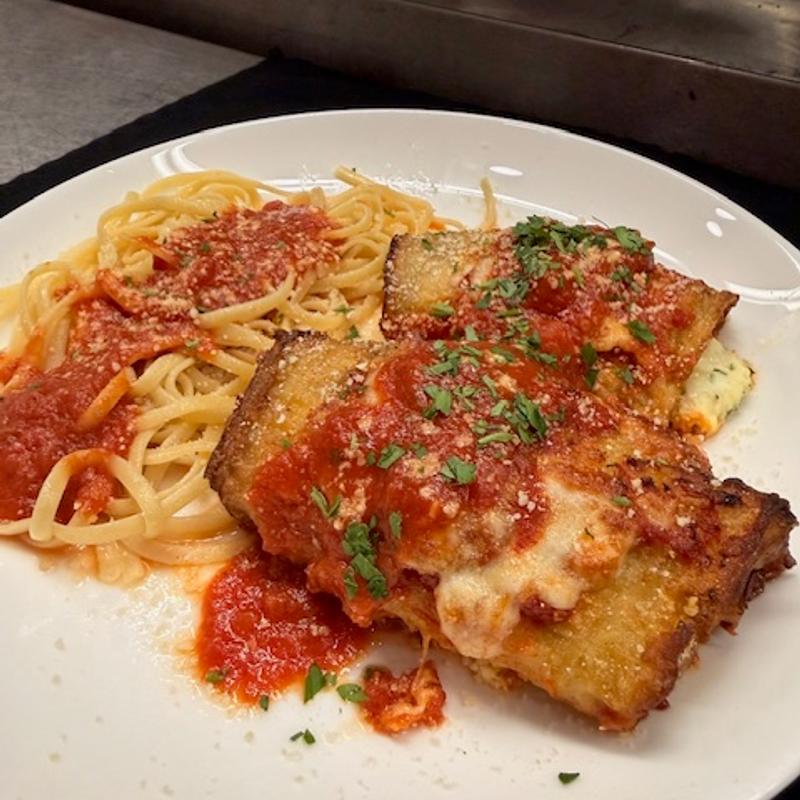 Battered eggplant, herbed ricotta stuffing, mozzarella cheese, marinara sauce, linguini