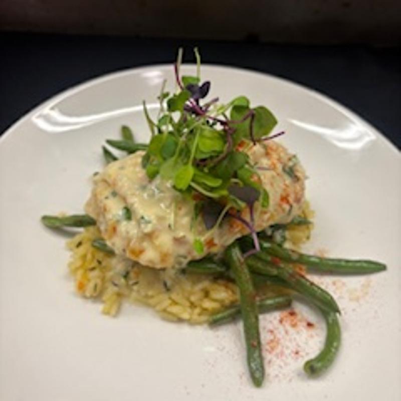 Stuffed sole with crab and scallops. Served over rice pilaf and fresh vegetables. Finished with a lemon white wine sauce.